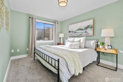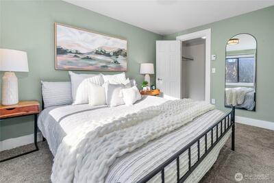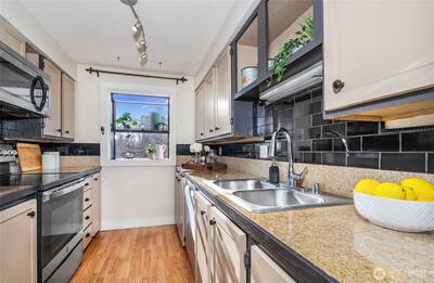 A rare 2-bedroom condo in the heart of Ballard—priced under $450K! This south-facing end unit in a boutique building is filled with natural light and offers views of Mt. Rainier. Enjoy all the perks of Ballard living without the hustle and bustle. A quaint neighborhood park on 14th Ave NW keeps traffic to a minimum. In Spring, when the cherry blossoms are in bloom, take a breather on one of the benches and absorb the natural beauty! Shops, restaurants, farmers markets, cafés, gyms, the Ballard Library, the Locks, and more—all just moments from your front door. Nearby public transportation makes commuting a breeze, whether you’re headed to work or one of the area’s highly sought-after schools. Inside, thoughtful features add to the sunny vibe: an oversized in-unit utility room with washer and dryer provides ample storage, while the spacious walk-in closet in the primary bedroom adds even more efficiency. A functional, bright kitchen with great cabinet space is just off a lovel