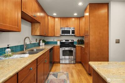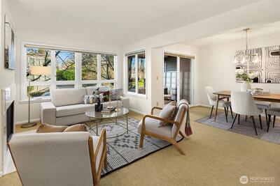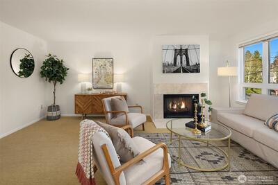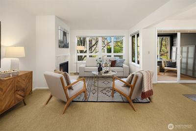 NEW PRICE! FABULOUS LOCATION, LOCATION, LOCATION! RARE - zero stair entry condo in boutique pet-friendly building w/elevator. This unit faces 60th Ave which is very quiet. Freshly painted & move-in ready, this 831 sq ft unit features a beautiful house-sized kitchen with eco-friendly Thai Rubber Wood cabinets, custom ceramic pulls, granite countertops & stainless appliances. Cozy wood-burning fireplace, in-unit laundry, & enclosed porch—ideal for a work-from-home office space. The large bedroom offers space for a reading nook & a generous walk-in closet. Bathroom has been updated with walk-in shower. Enjoy your private access to a big shared patio perfect for entertaining, BBQs and gardening. Community perks include secure entry, gated garage parking, bike storage & big storage space. Newer siding, roof & windows. Prime location near U Village, Burke-Gilman Trail, Magnuson Park, UW, and Children’s Hospital. Burke-Gilman bike trail is across the street and you can ride to Ballard or