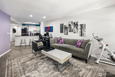 In an excellent location, this updated 1 bed/1 bath condo offers 634 SF of stylish comfort. Floor-to-ceiling windows fill the space with light, highlighting newer countertops, black stainless appliances, updated flooring, modern fixtures, and a soothing color scheme. Enjoy the gas fireplace and relax on your cozy covered balcony. The bedroom features a generous walk-in closet and a well-appointed updated bathroom. Includes one assigned parking spot in a secured garage. The building offers an inviting lobby and a stunning rooftop deck with city views, mountains, Lake Union, Puget Sound and Space Needle. Just blocks from the Broadway light rail station, restaurants, shops, trolley and downtown Seattle—urban living at its best.