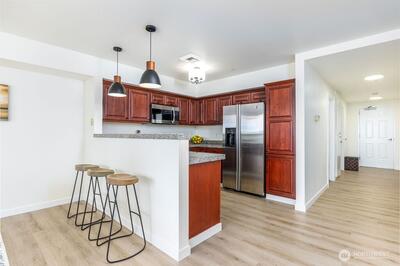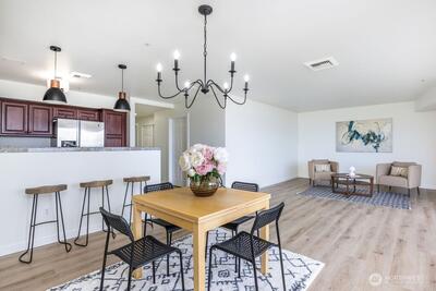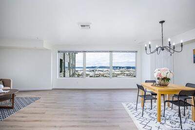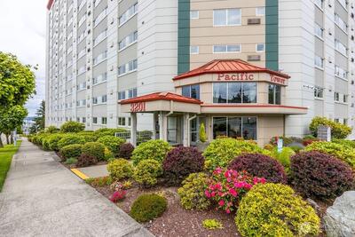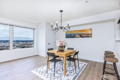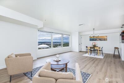 Experience luxury living with breathtaking views of Commencement Bay, the city skyline, Mt. Rainier, and the Tacoma Dome from this stunning 9th-floor condo! This beautifully updated unit features 2 bedrooms, 1.75 baths, luxury vinyl plank flooring, and stylish new light fixtures. The gourmet kitchen boasts granite counters and includes all appliances. Enjoy the sweeping views from the oversized living and dining areas. The primary suite offers a private bath and dual closets. With a separate laundry room, A/C, secure garage parking, and a fitness center, this condo offers it all. Prime location near downtown and freeway access!