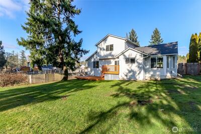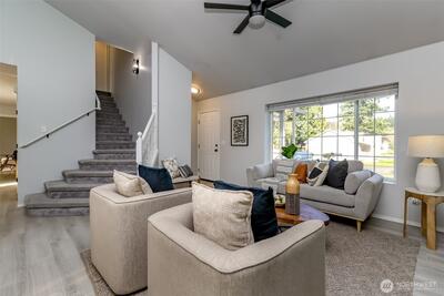 Nestled in the Oakview Heights community, this inviting home boasts a bright living room with vaulted ceilings and abundant natural light. The floor plan includes 3 bedrooms upstairs, including a spacious primary suite with an en-suite bath, plus a flexible bonus room on the main level to suit the buyer’s needs. New stainless steel appliances complement the kitchen, while the large deck is perfect for entertaining. Backing to a greenbelt and adjacent to a retention pond, the property offers exceptional privacy and a tranquil backdrop. Complete with a 3-car garage and a prime location near JBLM, this home combines comfort, space, and convenience.