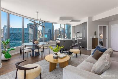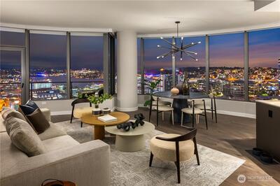 Spire Condominiums, at the apex of Belltown, South Lake Union, and Denny Triangle, offers iconic Space Needle and water views unlike any other new condo building. This coveted location allows easy access to retailers, restaurant/bars, technology hubs, arts, outdoor recreation, and entertainment. Rising to 41 stories of incredible living spaces that include this rounded corner 2 BR/2 Bath that offers downtown, SLU and Space Needle views, kitchen w/island, Bosch appliances, deck, and parking. Amenities include concierge, top floor fitness center, pet run, 40th floor clubroom, dining, terraces, co-working space, conference room, theater, movement studio + more. Buyer must register broker on first visit. Ask about our Winter Buydown incentive!