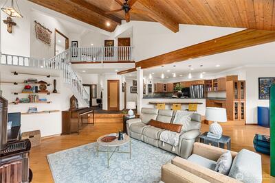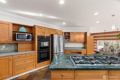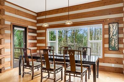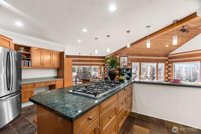 Just under 3000sf of stunning custom features sitting at the end of an incredible tree lined private lane - four minutes to Tumwater Valley Golf Course and I-5! Truly, this home is an absolute MUST SEE! This Appalachian-style square log home offers exposed beams, milled wood floors throughout and vaulted wood ceilings creating an authenticity difficult to find. The main living space feels open with abundant natural light and forest views in every direction. The kitchen opens to the living and dining areas, centered around a generous island with gas cooktop, a true cooks kitchen. This home has multiple rooms with closets, ideal for work-from-home options - guests or creative hobbies. The primary bedroom is an oasis, with treehouse views and a custom walk-in closet that’s was built by a master wood worker. The primary bathroom features a soaking tub, and newly installed luxurious steam shower. The outdoor living extends to a covered front porch and two elevated rear decks offering quie
