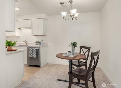 Minutes from Downtown Kirkland, this light-filled condo offers comfort, style, and exceptional convenience. The open layout features two bedrooms, an updated bath with a walk-in shower. The remodeled kitchen has new quartz counters & white cabinets. Large living room with easy access to the balcony—perfect for morning coffee/evening relaxation. Laundry room conveniently located next door. Secure building access and a well-maintained community add peace of mind. Unbeatable location near the Cross-Kirkland Corridor Trail, Met Market, parks, dining, and major tech campuses. Investor-friendly with no rental cap. HOA dues cover Water/Sewer/Garbage, insurance, exterior maintenance, and onsite management.