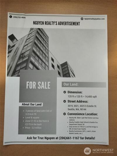 3 pieces of land with FAR of 3.25 & 4.75, Level & square, Zone C1-55 in the front & C2-75 in the back. Nearby Mt Baker Light Rail Station and frequent bus stations. Easy access to I-90 & I-5, and the bridge to SW & downtown of Seattle. Nearby businesses (QFC, Lowe's, Asian market, banks, etc...). Nearby Franklin High School & Seattle Fire Department Station 30. Buyers should check about new changes in land use code and building code from the Washington State and the Seattle City.