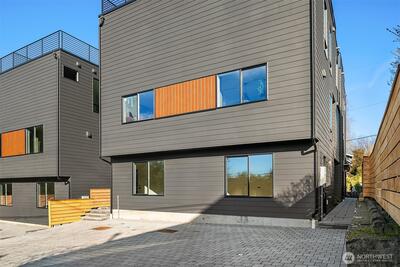 United Seattle presents this modern new home in the West Woodland area of Ballard. Main floor offers possible live/work option with a spacious flex space or bedroom containing a separate exterior access plus full bath. Second level includes functional kitchen with complete appliance package & quartz counters. Easy flow into living room for entertaining, complemented by powder room perfect for guests. On the top floor, find your primary suite with spacious bath, including heated floors, and walk-in closet. Third level also includes office or nursery with it's own private balcony. Roof deck allows low maintenance outdoor space with territorial views. Ample mini splits throughout for zoned comfort, plus thoughtful storage solutions. Off-street designated parking included.