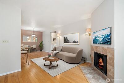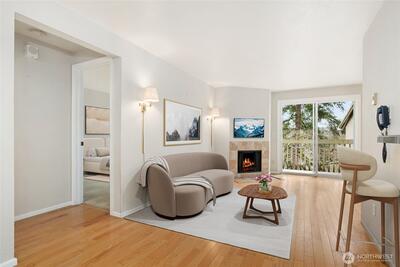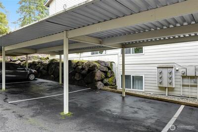 Welcome to this light-filled, top-floor residence in an exceptional location. This move-in-ready one-bedroom condo features hardwood floors, an open-concept layout, stainless steel appliances, granite countertops, and tile backsplash. The inviting living area includes a cozy wood-burning fireplace, while the spacious primary bedroom offers a walk-in closet and in-unit laundry. Storage closet on deck. The home includes a dedicated carport and ample guest parking. Ideally located just steps from shopping and dining in Downtown Redmond within a well-managed community with no rental cap—an excellent opportunity for both homeowners and investors. The unit is virtually staged!