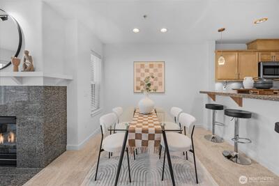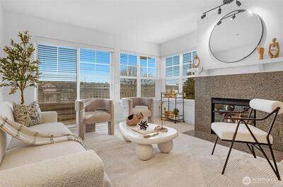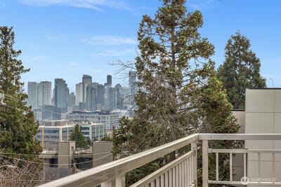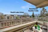 Wake up to sparkling Lake Union and downtown Seattle views from your own private 4th floor deck on Queen Anne's coveted east slope. Set on a quiet, tree-lined street, This luxury, boutique building (only 15 units) offers a calm, neighborhood feel just minutes from vibrant city life below. Morning sun pours into this bright and open east facing home. This spacious end-unit features an open layout with gas fireplace, primary w/walk-in closet & bath & a deck that truly extends your living space—perfect for morning coffee while watching the city wake up or unwinding as the skyline lights come on. Residents here enjoy a well-run, meticulously maintained building, thanks to an active, caring HOA community that prioritizes upkeep, safety, and pride of ownership. Thoughtful amenities include elevator, secure lobby & garage entrance. A rare bonus in this close in QA neighborhood: 2 secure garage parking spaces #23 & #24 and right next to your dedicated storage room #2B—an ideal setup fo