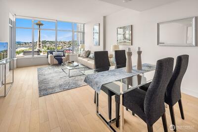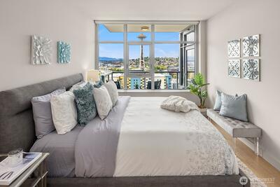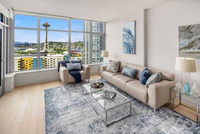 Stunning views of the Sound, Space Needle and Olympics await you in this coveted Insignia condo! Its open layout features full-length windows and luxurious finishes like engineered hardwoods, quartz countertops, and Bosch appliances. Gather in the integrated living and dining areas, step out for spectacular views on the balcony, or watch the city lights sparkle from your view bedroom. Incredible amenities are just an elevator ride away. Rated a Walker’s Paradise (99/100)—you can stroll to world-class dining, shopping, Pike Place Market, the waterfront, parks, and the South Lake Union Streetcar. Reserved garage parking and NO rental cap!