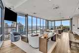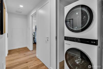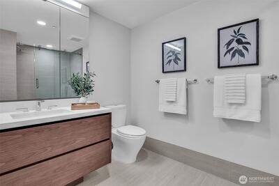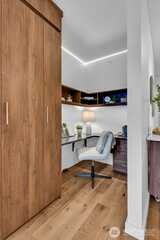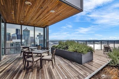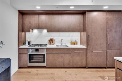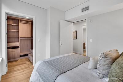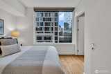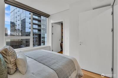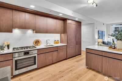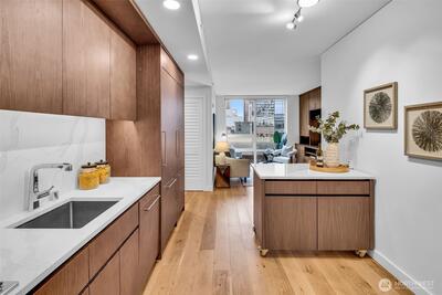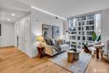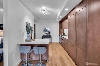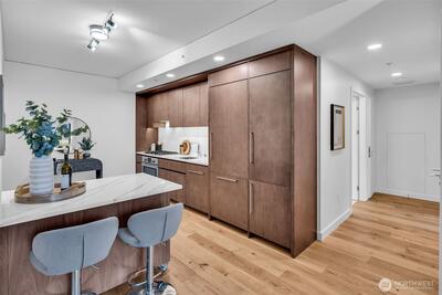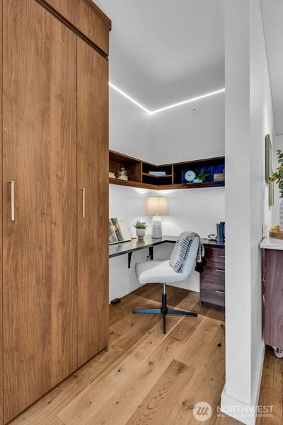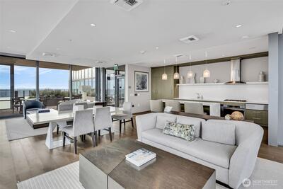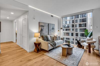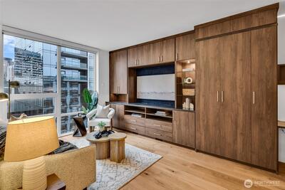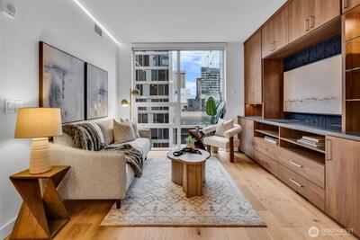 Seattle has a few true headliners, The Emerald is one of them. Rare downtown high rise home that feels thoughtfully curated, effortlessly elevated. Steps to Pike Place Market, Seattle’s reimagined waterfront, wrapped in floor to ceiling glass, tons of natural light, twinkly skyline, city views, 75k in upgrades you feel the second you walk into this spacious one bed + den home. Brand new wide plank hardwoods, custom lighting, scene settings in living, den, primary, bright by day, warm, cinematic at night. Showpiece kitchen, gas cooking, Pedini cabinetry, smart pull outs, built in drawer org, high end Bosch appliances (gas), marble style quartz, custom movable island, equal parts design statement and daily workhorse. Custom built in bookcases, integrated under cabinet lighting, den/office is the real deal, true bonus room for work or creative studio. Exceptional stg, huge walk-in custom closets and built-ins, everything has a place. Spacious primary w/large CC walk in, spa like en suit