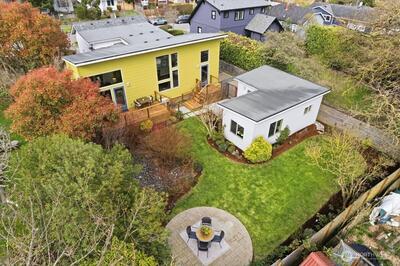 Architecturally striking with dramatic ceilings and walls of glass, this beautifully maintained Green Canopy custom home lives like new construction with high-end finishes throughout. The open-concept design is filled with natural light and offers seamless indoor-outdoor flow, creating an ideal setting for both everyday living and entertaining. The sleek chef’s kitchen features Bosch appliances, generous storage, and a large island that anchors the main living and dining areas. The oversized primary suite offers a private retreat with a spa-inspired bath, custom tile work, and a large walk-in closet. A versatile loft provides flexible space for a home office or potential fourth bedroom. The lower level includes two additional bedrooms with a Jack and Jill bath and a separate family room, well suited for guests or multi-generational living. A fully finished detached DADU is heated, powered, and built to a high standard, offering flexibility as a private office, gym, guest retreat, or