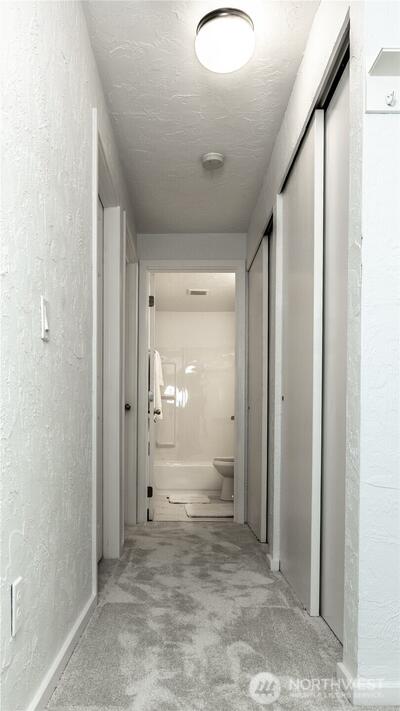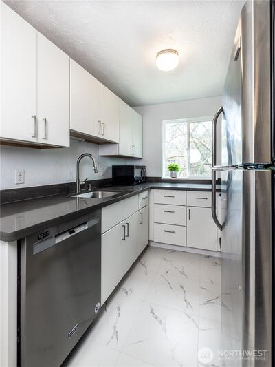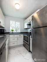 Light-filled, fully updated corner-unit condo in a prime Northgate location! This bright and airy 2-bedroom home offers an open-concept layout with brand-new carpet, ceramic tile flooring, fresh paint, new trim and doors, and abundant natural light from its south- and west-facing exposure. The living and dining areas flow seamlessly to a west-facing balcony, perfect for relaxing or entertaining. The new kitchen features crisp white cabinetry, elegant marble-style countertops, and stainless-steel appliances, while the updated bathroom includes a new bathtub, toilet, and vanity. Two well-separated bedrooms, large storage closets, and thoughtful updates throughout make this home both comfortable and functional. Enjoy a secure building with elevator access and on-site parking, plus an exceptional no rental cap—ideal for both homeowners and investors. Unbeatable convenience with the light rail station just a short walk away, making commuting to downtown Seattle, the UW, and beyond effortl