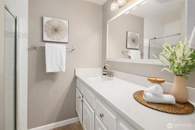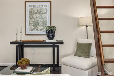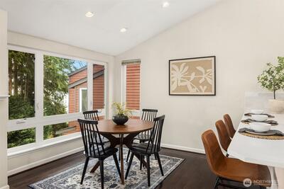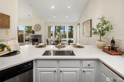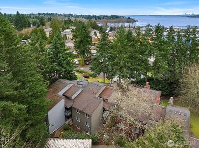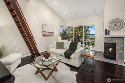 Top-floor corner Kirkland condo in the heart of Juanita featuring shimmering Lake Washington views, vaulted ceilings, and a private home office loft. This light-filled residence offers a spacious open-concept kitchen and dining area that flows into a grand living room with soaring vaulted ceilings. Enjoy the breathtaking Pacific Northwest backdrop of the Seattle skyline and Olympic Mountains from your large private balcony. The versatile floor plan includes 2 bedrooms and 1.75 baths, plus a rare bonus loft perfect for a home office or creative retreat. Enjoy tasteful updates to both kitchen and bathrooms, in-unit washer/dryer, ample storage, 2 parking spaces, and the quiet living of a gated community. Experience an incredible lifestyle with a high walk score: you are mere blocks to Juanita Beach Park, waterfront trails, and local restaurants. With easy commuter access to 405 and under 12 min to Google Kirkland, this is the ultimate Eastside retreat. Juanita Kirkland living at its fi