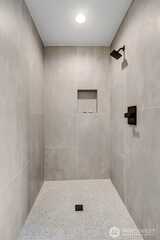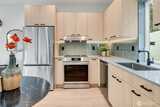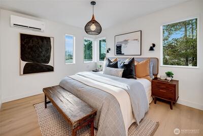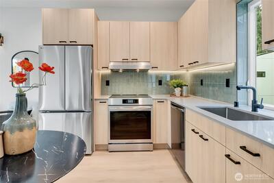 Cedar siding warms the exterior of this architecturally crafted attached ADU, designed for flexibility & modern ease. The main living level is filled with natural light. Open dining & living spaces, and a kitchen anchored by stainless appliances & refined finishes—perfect for everyday living or entertaining. The top floor is devoted to the primary suite, a calm retreat with a lux walk-in shower & integrated laundry space. The entry level hosts a private bedroom with slider access to the outdoors. The adjacent full bath with soaking tub creates an ideal guest suite or home office. Thoughtful details, A/C, dedicated parking, and nearby Light Rail enhance daily convenience. A polished urban dwelling where design, light & livability converge.