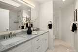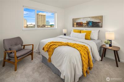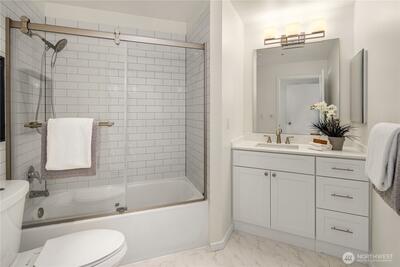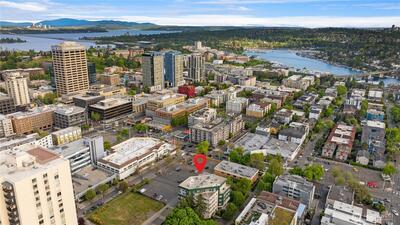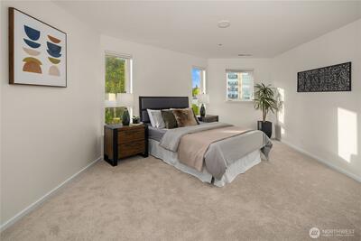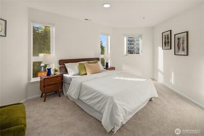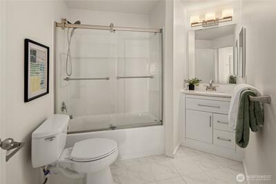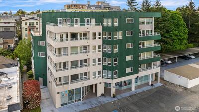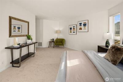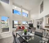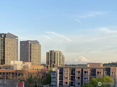 Rare opportunity to own a Two-Story Penthouse condo offering nearly 2,000 sq ft (1,998 sf) of living space—larger than many single-family homes in the area. This light-filled residence features 3 bedrooms + Den and 3 full bathrooms, thoughtfully laid out for both comfort and entertaining. The expansive open-concept living, dining, and kitchen area boasts high ceilings, central A/C, and large windows that frame stunning views of Mt. Rainier and the Cascade Mountains, enjoyed from both the living room and private balcony. The updated kitchen includes new appliances and a gas cooktop, perfect for home chefs. All three bathrooms have been recently updated, including spacious en-suite baths. The flexible floor plan offers excellent separation of space across two levels, ideal for guests, work-from-home, or multi-generational living. This is the one of few units in the complex with Two Parking Spaces—one secure garage space and one outdoor spot—plus secure building entry. This home is