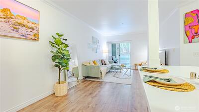 Welcome home to this inviting end-unit condo in the gated Bokara community. With added privacy and peaceful views of surrounding greenery, this home is a great opportunity for first-time buyers looking for comfort and convenience. The bright, open layout with high ceilings, makes everyday living easy, and the updated kitchen with quartz countertops and stainless steel appliances means you can move right in without the stress of projects. There is in-unit laundry. 1 covered parking with plenty of guest parking. Extra storage, because who doesn't love extra storage? The covered private patio area is spacious and great to have slow mornings and peaceful evenings. Enjoy durable LVP flooring and clean, modern updates that are both stylish and low maintenance. The location is a big win with quick access to I-405, I-5, and Highway 167, plus nearby shopping, dining, and The Landing. There is easy access to public transit. You are also just 10 minutes from Gene Coulon Memorial Beach Par