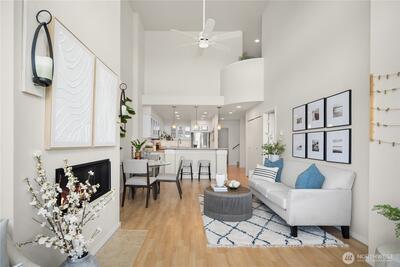 Unbelievable Lake Union & Cascade mountains views, Elegant 2-level condo with 2 primary suites, vaulted ceilings, 2-story windows pour in lots of natural light into all spaces. Huge open kitchen & living areas are ideal for entertaining or cozy up to the gas fireplace. Main level has an office/den & large bonus space. Balconies on both levels! Walking distance to SLU waterfront, Fremont, Amazon, Google, Meta offices! Easy access to I-5 & 99. This unit comes with 1 secured parking spot & a storage unit.