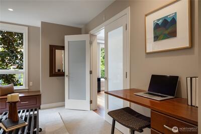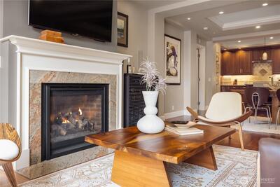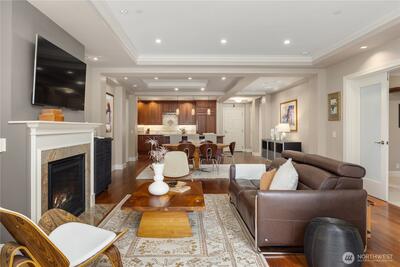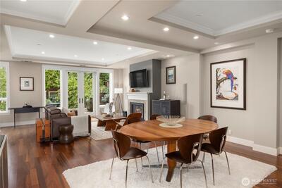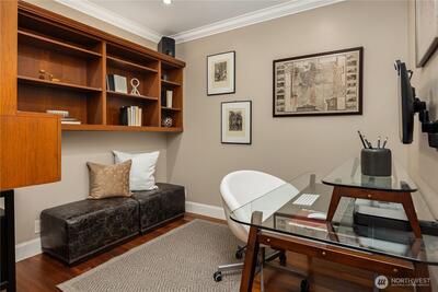 Harvard & Highland // Nestled within the private, brick-clad enclave of Harvard & Highland, this sun-filled west-facing courtyard residence offers a rare blend of timeless architecture and elevated craftsmanship in the heart of Seattle. Designed for those who appreciate refined details and effortless living, this home balances warmth, elegance, and everyday comfort. Bathed in natural light, the thoughtfully designed floor plan lives large, featuring two spacious bedrooms plus a versatile den and three beautifully appointed bathrooms. Whether hosting intimate gatherings or enjoying a quiet evening at home, the layout provides exceptional flexibility and flow. Throughout the residence, curated finishes reflect enduring quality: rich cherry cabinetry, polished granite surfaces, coffered ceilings, custom millwork, and gallery-style art lighting that elevates both everyday living and special occasions. The kitchen seamlessly connects to the main living spaces, creating a welcoming atmospher