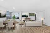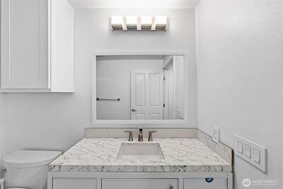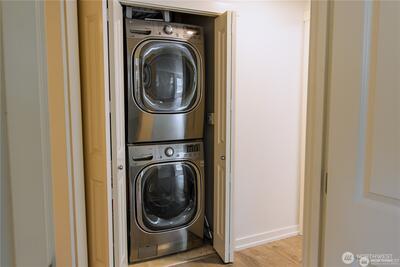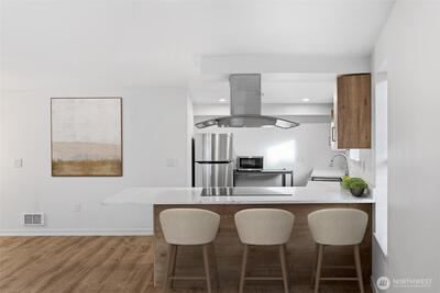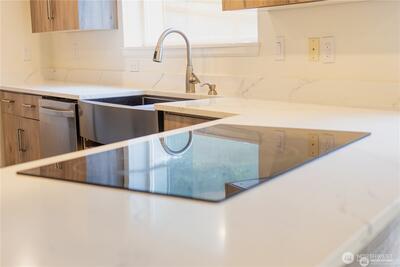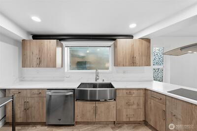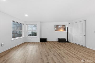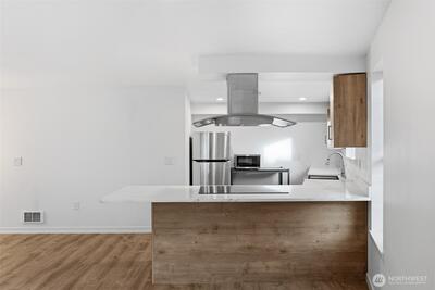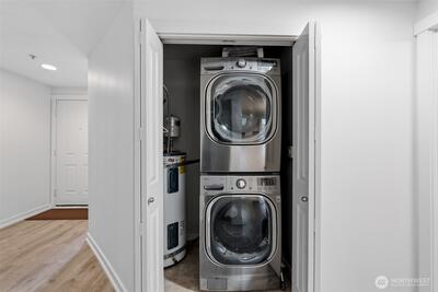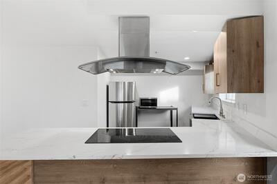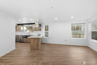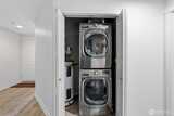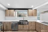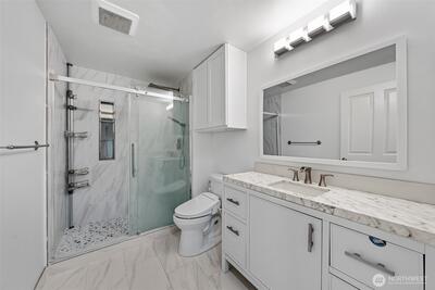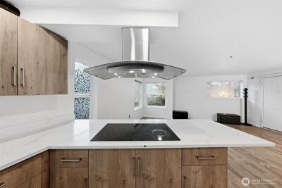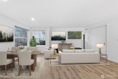 A rare top-floor corner layout: although the building spans three stories, this unit sits above only two—delivering the serenity of top-floor living with no footsteps overhead and enhanced natural light. Effortlessly walkable to lakefront trails, 5 mins to Juanita Beach Park, Friday Farmer's Market, dining hotspots & shops, plus Bus stop at Super 24 right in front—easy access to Seattle downtown. Totem Lake Mall just 5 mins by car for effortless shopping. Recent upgrades bathroom into Spa-inspired with white shaker cabinets, Calacatta quartz vanity (undermount sink, matte black Delta faucets), frameless glass shower (subway marble tiles, pebble floor), porcelain plank tiles for serene elegance. Chef's Dream Kitchen designed with Warm oak shaker cabinets frame glossy Calacatta quartz counters; deep farmhouse sink under brushed nickel pull-down faucet; induction cooktop with stainless Zephyr hood; white subway backsplash; LG stainless appliances—flooded with natural light over gre