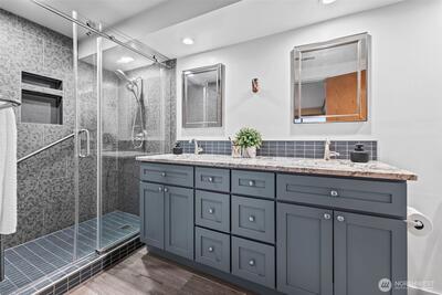 A view that makes an impression and invites you to slow down and savor each moment. Year-round views overlook the Narrows Bridge, the Olympic Mountain range, Gig Harbor, and Salmon Beach, offering something beautiful at every hour of the day. Inside, thoughtful updates shine throughout, starting with the beautifully remodeled kitchen where no detail was overlooked. Quartz countertops extend seamlessly up the backsplash, complemented by under-cabinet and interior cabinetry lighting, a beverage fridge, and elevated finishes that make both everyday living and entertaining a joy. The kitchen flows effortlessly into the open-concept dining and living spaces, all framed by those unforgettable views. Both bathrooms have been fully remodeled with spacious walk-in showers, creating a spa-like feel. The large primary bedroom offers comfort and calm, while the second bedroom provides flexibility with a Murphy bed—perfect for guests, a home office, or both. Parking includes a one-car garage with