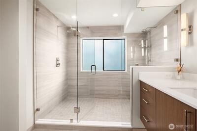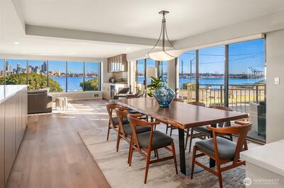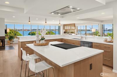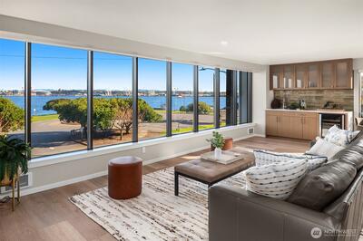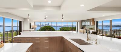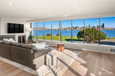 This extraordinary full-floor 3-bedroom residence on Alki commands unrivaled 270° panoramic views, your front-row seat to downtown Seattle, the Space Needle, the Cascade Mountains and the iconic Elliott Bay with its ever-changing maritime activity. Floor-to-ceiling windows wrap this luxury home on three side, offering unobstructed views from every window and filling it with natural light from sunrise onward. Masterfully renovated with over $490K in luxury upgrades, the open floor plan features a stunning chef’s kitchen with massive wrap-around counters, oversized pantry, and an expansive eating bar—ideal for culinary enthusiasts and effortless entertaining. Wide-plank flooring, custom built-ins, inviting gas fireplace, mini-split, and high-end finishes create a refined, modern living experience. The spacious primary bedroom includes a beautifully updated en-suite, with two additional bedrooms offering flexible use for guests, office, or creative pursuits. Direct keyed elevator ope