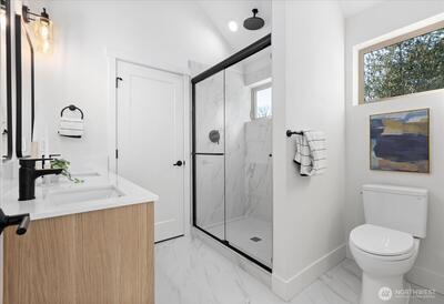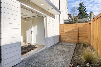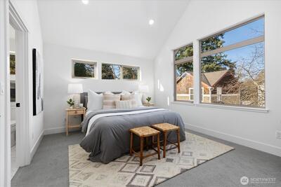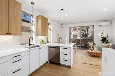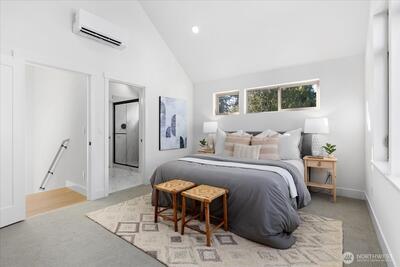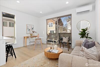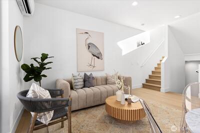 Experience contemporary urban luxury in this light-filled, new construction home located in the heart of North Seattle. The open-concept main floor is highlighted by a chef's kitchen featuring striking quartz countertops, premium stainless-steel appliances, custom cabinetry and abundant storage. Bathed in natural light the living area offers a seamless transition to a private balcony perfect for enjoying a morning cup of coffee or the afternoon summer breeze. Retreat to the upper level to find a spacious primary suite defined by dramatic vaulted ceilings. The spa-inspired ensuite bathroom includes a dual vanity, sleek modern fixtures, and a glass enclosed walk-in shower wrapped in designer tile. On the lower level, a versatile bonus room offers the perfect flex space for a home office, gym, or guest retreat and features direct access to a private fenced patio, alongside a separate secondary bedroom. Additional highlights include energy efficient mini-split heating and cooling, dedicate