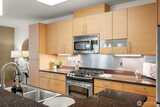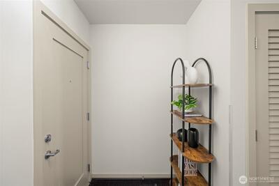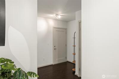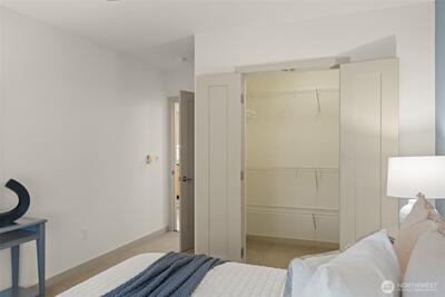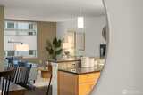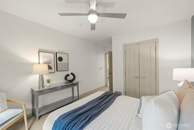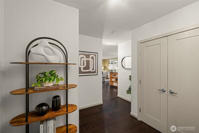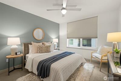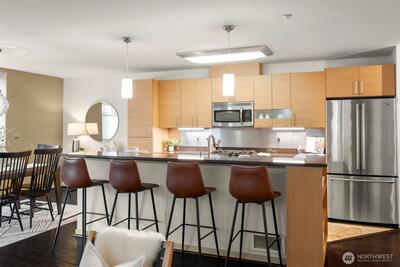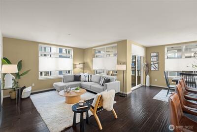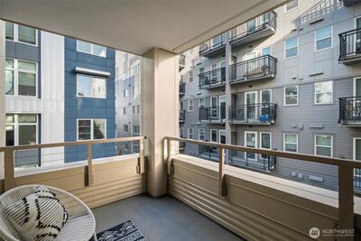 Welcome to Hjarta in the heart of Ballard! This spacious one-bedroom corner unit on the 5th floor offers 921 sq ft of modern, open living. Kitchen features a large island, complemented by a full bathroom, large bedroom, and walk-in closet. Separate office space perfect for working from home. Private balcony extends your living space. TWO parking spaces, well located, both in first level of secure garage parking. A large storage unit is a nice bonus. Desirable end unit! Steps from Ballard's best dining, cafes, shops, and transit. Built with durable steel-and-concrete construction and LEED certified. Building amenities include rooftop patio with p-patch, BBQs, gym, and rec room. Well-run HOA includes water, sewer, gas, trash, and hot water!