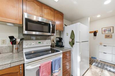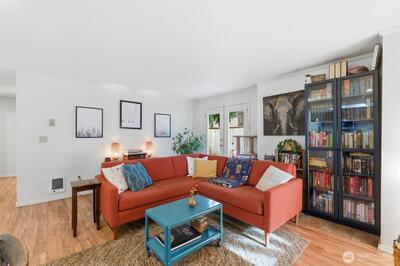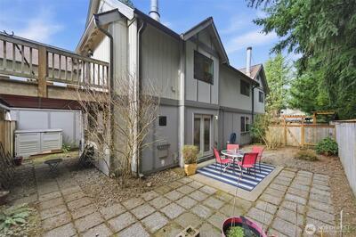 Light and bright coveted ground-floor condo with oversized, private courtyard. Backing up to a quiet greenbelt, enjoy raspberries when in season, gorgeous lilies, and bleeding hearts. Generously sized primary with en suite bathroom and additional bedroom and bathroom. Sparkling floors with updated fixtures and paint. Fantastic community amenities featuring a Clubhouse with a large shared kitchen, gameroom, gym, and sauna. Outside you'll find a large pool, community garden, play space, and electric vehicle chargers. What an incredible opportunity for a primary residence or investment opportunity (no rental cap!).