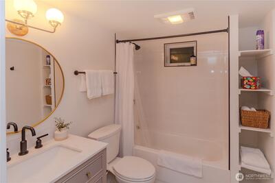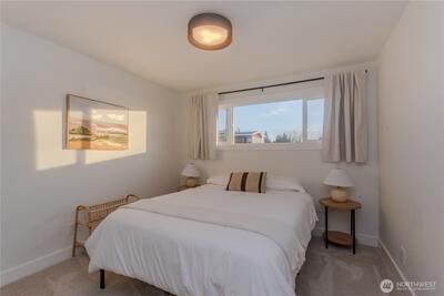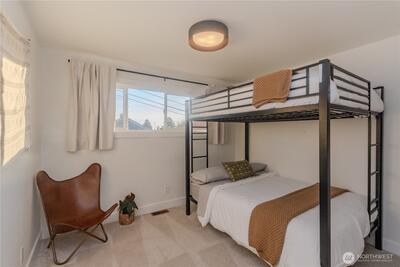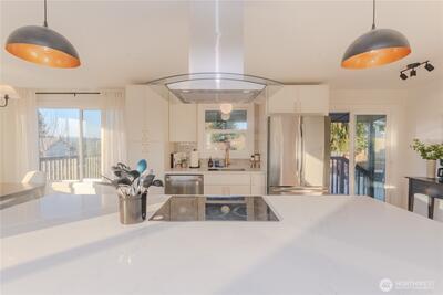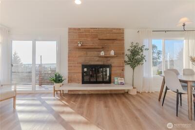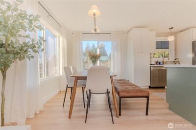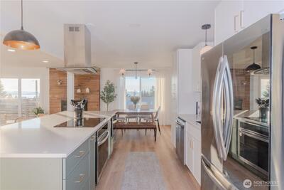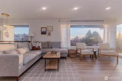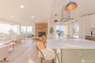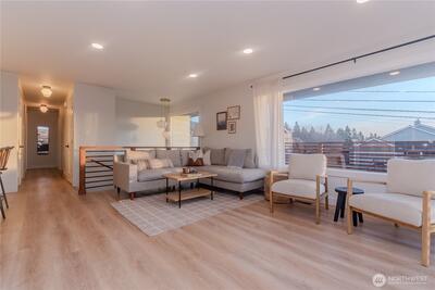 Unlock Your Dream Home in the Heart of Normandy Park. This beautifully reimagined mid-century modern residence offers breathtaking Sound and mountain views from the main living spaces and private deck. Thoughtfully renovated by a designer, the home features 1,960 sq ft of well-designed living space with an open-concept kitchen, dining, and living area—perfect for entertaining or everyday comfort. The lower level includes a spacious recreation room and a full-size laundry room with an additional full bath, offering flexible living options. Enjoy peace of mind with extensive 2024 upgrades, including a new heat pump with A/C, upgraded 200-amp electrical panel, conversion from septic to city sewer, all-new plumbing, a new roof, new appliances, washer and dryer, and new flooring throughout. Nearly half of the electrical has been updated, and new windows have been installed throughout the home (excluding the oversized living room window). Additional features include a two-car garage