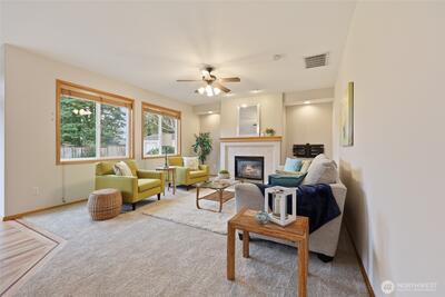 Welcome to this beautiful Puyallup home, located in a fantastic neighborhood with NO HOA! This gorgeous 3 bed, 2.5 bath home is filled with thoughtful features sure to meet your every need. This home has been enjoyed by only one owner with every aspect meticulously maintained – offering true peace of mind in a beyond move-in ready home! Spanning nearly 3,000 square feet and boasting new carpeting, freshly refinished hardwood floors, dedicated home office, formal dining room, butler's pantry, convenient storage built in throughout, plus a large bonus room – you do not want to miss this! The spacious kitchen flows into a great room with cozy gas fireplace and direct access to the outdoor patio – perfect for entertaining or simple enjoyment. Upstairs all bedrooms are generously sized with walk-in closets. You’ll even enjoy views of Mt. Rainier and the Olympic Mountains! The expansive primary suite is a true retreat. Showcasing vaulted ceilings, a sitting area, and 5-piece en-suite