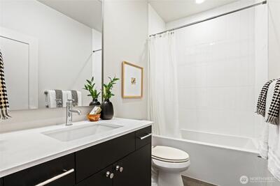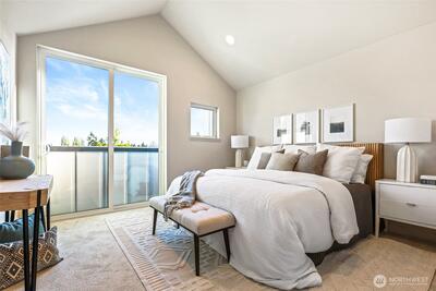 Welcome to Elm—a striking community of modern townhomes where designer style meets North Seattle convenience. This stunning 3-bedroom home spans over 1,500 sq ft, offering a sun-drenched, open-concept floor plan designed for effortless entertaining. The chef-inspired kitchen serves as the heart of the home, featuring a large island with eating space, sleek quartz counters, and premium stainless steel appliances. Retreat to the expansive top-floor primary suite, a private sanctuary boasting vaulted ceilings, floor-to-ceiling windows, and a spa-like ensuite with dual vanities. Step out onto your private South-facing balcony to soak in the sun or distant city views. Two additional bright bedrooms provide the perfect space for guests or a quiet home office. Enjoy the best of Greenwood living, just moments from Carkeek Park, Met Market, and top-rated local dining. With a dedicated parking spot for easy living and quick access to I-5/Hwy 99, Elm offers the perfect balance of luxury a