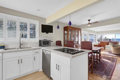 This updated Mid-Century 1 story home with finished basement in Seahurst, is set up to showcase the breathtaking views of the Puget Sound, Olympic Mountains and unforgettable sunsets throughout the house. This home was custom built to enjoy the views from most rooms in the home. It features new roof in 2026, original hardwood floors, Generac generator, Italian plank floor tiles in kitchen, A/C, heated tile floor in primary bathroom and so much more. On the main living area you'll find 3 bedrooms and just off the living room, French doors that take you out to a large covered rooftop deck perfect for year round entertaining or just relaxing. Downstairs has plenty of room for storage, entertaining and possible 1 bedroom for multigenerational living. There is a 2 car garage with 9ft doors and a 3rd car garage with carport extended off of it for plenty of covered parking. Outside has back patio with firepit, hobby green house, mature landscaping with 3 raised garden beds, beautiful foliage