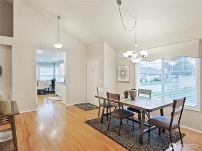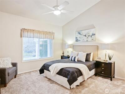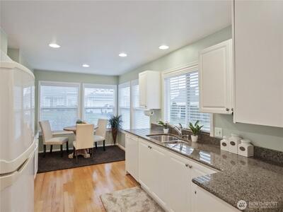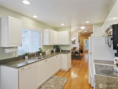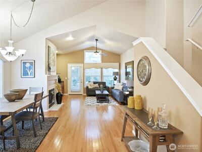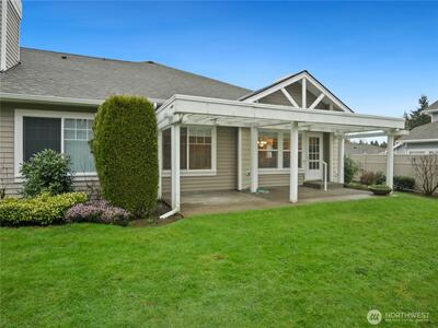 Welcome to Marina Pointe, the premier gated & private community at The Lakes. With a thoughtfully designed layout ideal for comfortable living that features vaulted ceilings in living & dining rooms, and makes it feel much larger with lots of natural light throughout. The living room features a built-in entertainment center, a cozy gas fireplace and access to a private patio that backs up to a peaceful greenbelt perfect for relaxing or entertaining. This level entry (no steps) end-unit features a main floor primary suite with a five-piece bathroom, that includes a soaking tub and walk in shower and closet. The kitchen has a lovely, sunny eating area. Upstairs, you’ll find 2 additional bedrooms, a full bath, and a versatile loft space ideal for a home office or den with built-in shelving. Residents enjoy a secure gated entry, access to private parks, a tranquil lake & miles of walking & bicycling just beyond your back door on the green river trail. Ideally located near Kent Station sh