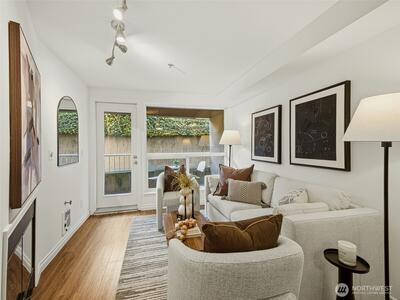 Ideally located between Capitol Hill and South Lake Union, this move-in ready, south-facing condo at Jackson Court offers exceptional privacy and a quiet urban retreat. Freshly painted throughout, it features an open living area with a cozy gas fireplace and dining space flowing to a private patio with storage. The functional kitchen, updated bath, and spacious walk-in closet provide comfort and convenience. In-unit laundry, dedicated parking, gym, and rooftop deck included. Pet-friendly with no rental cap — come see for yourself how peaceful this unit is!