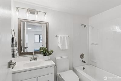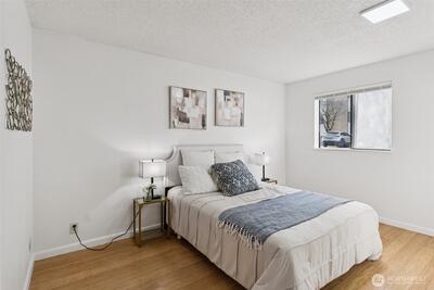 Beautifully designed garden-level condo featuring a spacious 3 bed, 2 bath layout with fresh, 2026 thoughtful updates throughout. Light and bright living spaces are enhanced by bamboo floors, bold design details, and a cozy wood-burning fireplace that anchors the living room. The updated kitchen offers quartz countertops, brand new stainless steel appliances, and flows seamlessly into a dedicated dining area with built-in cabinetry for extra storage. Both bathrooms have been refreshed, new carpet along with new washer and dryer, adding everyday comfort and convenience. Step outside to a private patio off the living room, complete with an additional storage closet. Generously sized rooms provide flexibility, while two off-street parking spots and extra storage are a rare bonus. Set in a great Bellevue location close to shopping, dining, parks, and amenities.