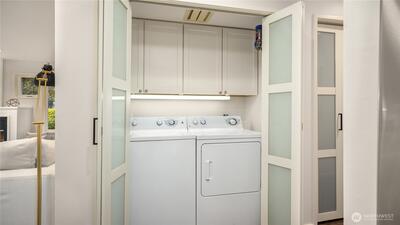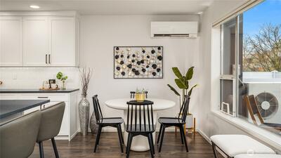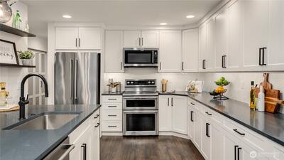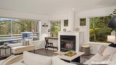 Live the vibrant downtown Kirkland lifestyle! Boutique community w only 14 units. Homes like this don't come along often! This home lives large & is beautifully renovated! 2 bed/2 bath corner unit features an abundance of windows & natural light! Fully redesigned, dream chef's kitchen w expansive island, quartz counters, soft close cabinetry, double ovens & beverage cooler! One level living at its best! Expansive open floorplan, entertainment sized great rm & dining features wood burning fireplace, a/c, laminate hardwoods & opens to one of the largest private patios! Spacious primary bed w walk-in closet, remodeled on-suite w double sinks, beautifully tiled walk-in shower & ample storage. Large secondary bedroom/office. Spacious grassy area right out the door, perfect for pets to play or entertain! Secure lobby w elevator, gated parking garage w 2 reserved spaces & storage unit. Walk to restaurants, cafes, shopping, grocery & the waterfront! Cross Kirkland Corridor, Peter Kirk Park & P