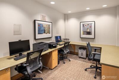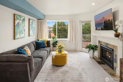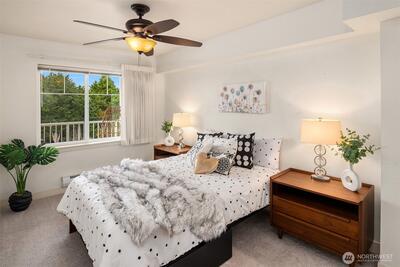 Vibrant upscale living and peaceful surroundings in the heart of Ballard. Perched on the 5th floor, this beautiful light filled home features 854 luxurious square feet, a bedroom suite with walk-in closet, spacious studio, full bath with accessibility tub, kitchen & eating bar, dining area, living room with gas fireplace, utility room & full-size washer/dryer, oversized balcony, secure parking space, and large 5x7 heated storage unit. Move-in-ready with new carpet and interior paint. Ballard Place community provides full-time concierge staff, elevator, gym, sauna, conference & computer room, entertainment lounge with new furnishings, full-size kitchen & eating counter, and patio for BBQ & hosting, plus rooftop deck & pea-patch garden. Well managed HOA with no special assessment and no rental cap. Amazing 98 Walk Score offers top dining, shopping, farmers market, library, and breweries just steps away. Easy access to Downtown, Shilshole Bay, UW, and Discovery Park, with top-rated school