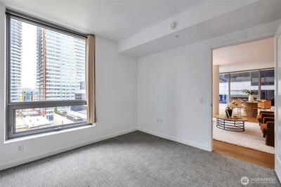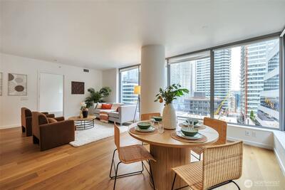 Welcome to the Seattle’s architecturally iconic glass tower. This sophisticated 2-bedroom 2-bathroom residence offers a seamless blend of high-tech innovation and modern luxury. Sunlight pours through floor-to-ceiling windows, highlighting wide-plank hardwoods and a sleek, low-profile chef’s kitchen featuring integrated appliances and quartz countertops. Retreat to a primary suite with a spa-inspired bath. Enjoy the world-class amenities: a 41st-floor Sky Club, panoramic rooftop terraces with BBQs, sky-high library, a professional fitness center, co-working spaces, 24/7 concierge and a dedicated dog lounge. With a Walk Score of 97, perfectly positioned for a 5-minute commute to major tech campuses and minutes from Seattle’s best dining and nightlife. Secure parking and storage included. No rental cap!