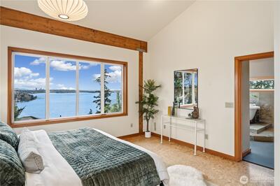 Perched above Lake Washington in Juanita, this NW contemporary home captures truly breathtaking views—stretching from downtown Bellevue and Kirkland across Lake Washington to the Seattle skyline, with Mount Rainier rising in the distance. Designed to embrace its setting, the home features vaulted ceilings, skylights and walls of windows that flood the interiors with natural light and frame the ever-changing scenery from nearly every room. The home has two sections- the main home and an ADU. The main residence offers 3 bedrooms and 2 baths (3 total bathrooms), a huge loft area with a sitting room off the primary suite with the main living areas ideal for entertaining and enjoying the view. A dedicated studio provides the perfect flex space for a home office, creative pursuits, or fitness. The ADU has 2 bedrooms with a 3/4 bath, a large kitchen and private entry. It's ideal for guests, extended living, or potential rental income. Set on an 11,394 SF lot with deeded community beac