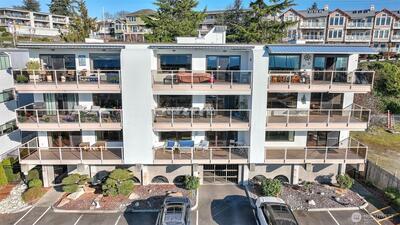 Wake up to salt air, sunsets, and the rhythm of the marina—this is waterfront living the way it’s meant to be. Nestled in the heart of the Des Moines Marina district, this beautifully updated condo places you just steps from the boardwalk, pier, beach park, dining, and vibrant community events. Inside this 2-bedroom, 1.75-bath, 1,248 sq ft residence light pours through expansive windows, framing sweeping Sound and mountain views and setting the tone for relaxed coastal living. The open living and dining spaces flow effortlessly to a generous west-facing deck—your front-row seat to unforgettable sunsets, evening grilling, and entertaining with friends. A cozy gas fireplace anchors the living room, while the kitchen blends style and function with stainless steel appliances, granite counters, and ample storage. Retreat to the spacious primary suite with a walk-in closet and modern ¾ en suite bath with updated finishes. A second bedroom and full bath provide flexibility for guests o