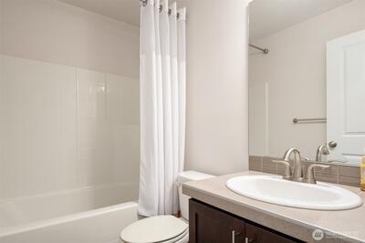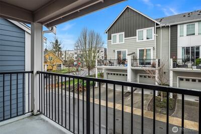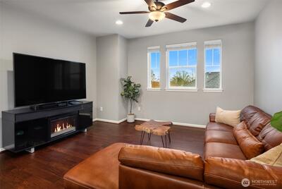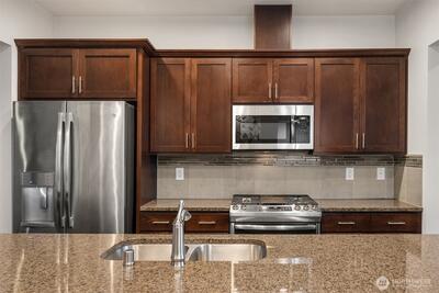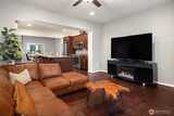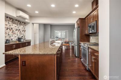 Nestled within the tree-lined High Point at Graham community, this 2-bedroom plus den townhouse offers comfort, flexibility, and a wonderful opportunity to make it your own. The thoughtfully designed layout is move-in ready, featuring engineered hardwood floors and a bright, open main level ideal for everyday living and entertaining. The kitchen is both functional and inviting, with quartz countertops, a tile backsplash, gas cooking, stainless steel appliances, and a rare bonus of extra counter workspace and cabinet storage—perfect for anyone who enjoys spending time in the kitchen. Step outside to your private deck and enjoy a quiet morning coffee or relaxed evening. Upstairs, a versatile den provides the perfect flex space for a home office, reading nook, or creative retreat. The two bedrooms are spacious and filled with natural light, each offering the comfort and privacy. Energy-efficient ductless mini-splits provide year-round comfort, while the oversized garage includes an EV c