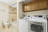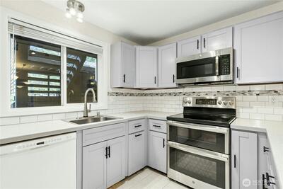 Welcome to Calidad! A beautifully updated condo featuring an open, flowing floor plan designed for comfort and ease. This unit showcases a trendy remodeled kitchen with a double oven, tile & LVP flooring, crisp counters and stylish grey cabinetry. Relax in the great room by the fireplace, complete with a wet (wine) bar or entertain in the spacious dining area with room for many guests. The large primary suite offers a generous walk-in closet, an updated 3/4 bath plus a door to your private patio to enjoy serene, verdant views, provided by a green-space & the golf course. There’s a 2nd bedroom plus a large, full bath-laundry combo that adds everyday convenience. Warm, welcoming, and thoughtfully maintained, this condo also includes two parking spaces, one is covered, plus low HOA dues. An excellent location just minutes from downtown Bellevue, close to light rail, shopping, dining, I-405 & 520, plus only 12 minutes to SLU. All this and much more!