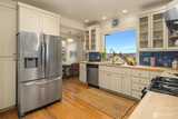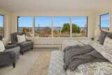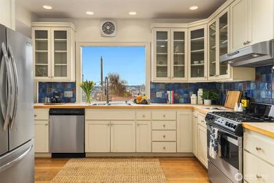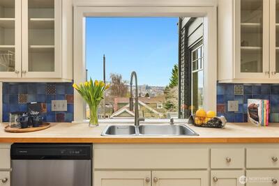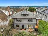 Classic 1914 Foursquare on a quiet North Capitol Hill street, blending timeless charm with amazing views. Enjoy sweeping vistas of Lake Union, Lake Washington, and the full mountain lineup from the Olympics to the Cascades. A short walk to neighborhood parks, this 4-bedroom, 2.5-bath home sits on a 4,000 sq ft lot and offers a rare two-car garage with flex outdoor space above and potential to build up, plus a fully fenced front yard—perfect for BBQs, entertaining, and pets. Hardwoods run throughout the home, complemented by fresh interior paint and new carpet. High ceilings enhance the sense of space and light. The main floor features a charming den/office, a cozy fireplace, an open flow from the kitchen to the dining room, and a bonus library-sitting room—ideal for reading, relaxing, or hosting intimate gatherings. Unfinished basement with 7' ceilings with great potential. Bring your vision and there are endless opportunities! Upstairs, the spacious primary suite includes a
