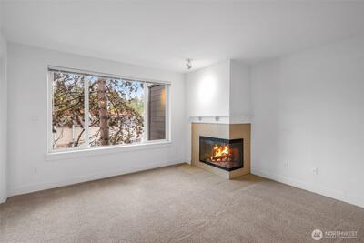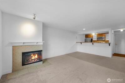 Combining the best of nature and city, the Cove at Veridian is set on 5 acres of landscaped walking trails, gardens, and dedicated pet areas. This luxurious home includes stainless-steel appliances, warm cabinetry and tile accents. Spacious granite kitchen flows into the open living room featuring a wood burning fireplace and new carpet and paint. Private deck includes abundant secure storage closet. Lavish bath boasts en-suite laundry, tile counters and tile tub surround. Large mirror with ample lighting. Residents enjoy a modern clubhouse including flat screen TV, indoor hot tub and gorgeous heated outdoor pool, fitness center, yoga studio, and private access to Bitter Lake Park. Secure parking garage with assigned parking space and plenty of guest parking. There is no Rental Cap, caring-quiet community, on-site manager + bus line. HOA covers water, garbage, sewer. Walk to the Broadview Library, The Broadview Tap house for a cold brew or shop at Sprouts Market. EZ Access to I-5 and