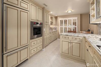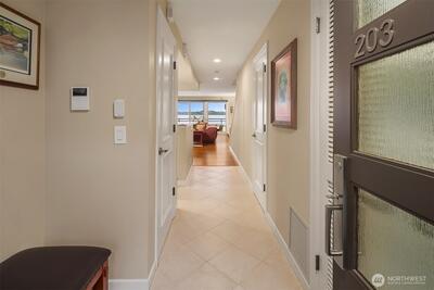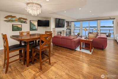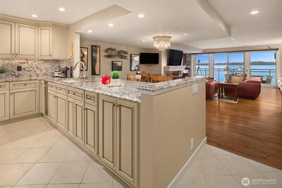Where else can you “OWN WATERFRONT,” have your own boat slip, and be walking distance to Downtown Kirkland for this price? Welcome to an exceptional boutique residence—extensively remodeled—within a gated building of just 9 homes. Enjoy a surprisingly private, quiet setting with a wonderful cross breeze that makes the home feel fresh and airy. Step inside to sweeping panoramic views of Lake Washington, the Olympic Mountains, and the glittering Seattle skyline after dusk. The thoughtfully designed two-level floor plan offers 2 bedrooms and 2.5 baths, including a spacious primary suite with a stunning, luxurious bath featuring heated floors. The classic kitchen features exceptional-quality, timeless French Baroque-style cabinetry, while hardwood flooring anchors the main living and dining spaces. Step out to a generous balcony—perfect for outdoor entertaining and sunset watching. A deeded boat slip with a new lift is included, 3 parking spaces, 2 of which are secured i