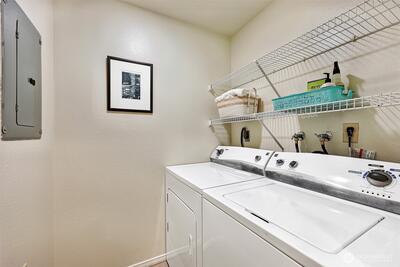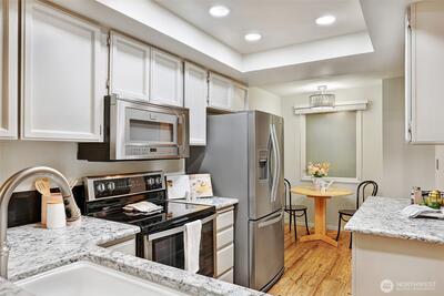 Welcome to Forest Villa, a serene and beautifully landscaped gated condo complex nestled in over 7 acres of Pacific Northwest woodland retreat. Enjoy easy living in this 2 bedroom/2 bath ground floor unit with generously-sized living spaces and double-wide doors to the bedrooms. Nicely maintained with new carpeting, paint and bathroom floors, updated lighting too. Well-appointed kitchen with stainless appliances, granite counters and charming breakfast nook. The generous living room with cozy gas fireplace, laminate flooring and covered deck is perfect for entertaining with a dining area large enough to accommodate holiday gatherings. Oversized primary suite with two closets (including a walk-in), picture window overlooking the lush condo grounds, and vanity with double sinks. Convenient and hard-to-find laundry room with side-by-side washer and dryer. The garage parking is easily accessible via the elevator, and the building is pet-friendly. Every day is a vacation with resort-style l
