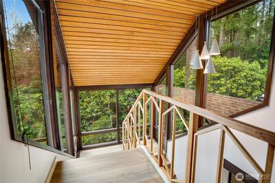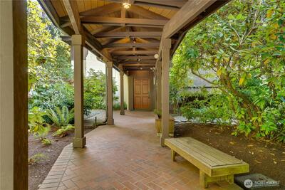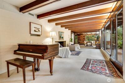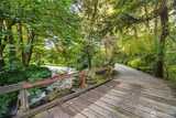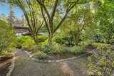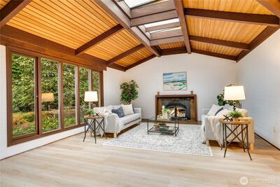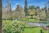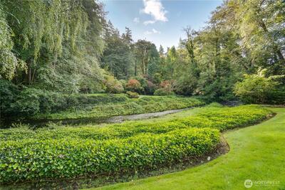 Quietly approached by a private forested driveway over a flowing creek, an Alan Liddle–redesigned home rests on 12 ACRES of tranquility. A peaceful & inspiring setting could easily spark the imagination of an artist or writer. Towering rhododendrons soften the architecture, while sounds of nature accompany you under the covered walkway to the entrance. The natural light draws you to a generous library with built-ins & fireplace creating an intimate retreat for reading & reflection. The adjoining living room is anchored by a fireplace & a dramatic wall of floor-to-ceiling windows creating a striking backdrop for a grand piano. French doors open to a patio overlooking Chambers Creek, expansive lawn—ideal for entertaining or quiet evenings at home. The dining room flows seamlessly enjoying creek views beneath a crystal-adorned chandelier. The kitchen offers an eating bar & sunny nook with views of the rear garden & patio, blending everyday comfort and effortless living. The primary su