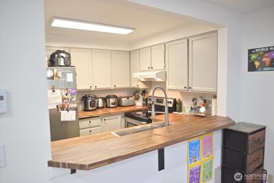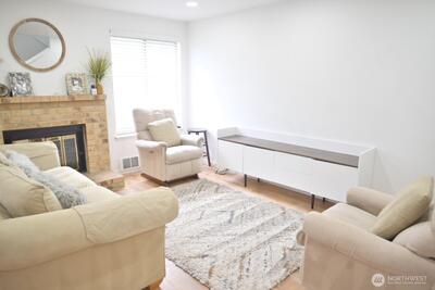 Beautifully updated, versatile townhouse with main-level entry and spacious living and dining areas featuring a cozy fireplace and private balcony. The upper level offers two bedrooms with a shared full bath plus a large primary suite with en suite and abundant storage, including an extra-large walk-in closet. The lower level provides exceptional flexibility as a grand primary, MIL, or potential rental space, complete with a tiled en suite bath, kitchen cabinetry with sink, ample storage, and a private patio/garden with separate entrance. Extensively updated in 2025: popcorn ceilings removed; new LVP flooring in living/dining; new tile in entry and kitchen; new butcher block countertops and backsplash; fresh interior paint throughout; new light fixtures and switches; new thermostats; new faux wood blinds in bedrooms (blackout); and a brand-new wood deck. Walk Score 87—close to Burien, Seattle, Sea-Tac Airport, I-5, SR-509 & SR-518. NO RENTAL CAP. Sold fully furnished—a tu