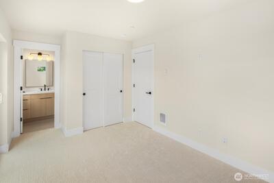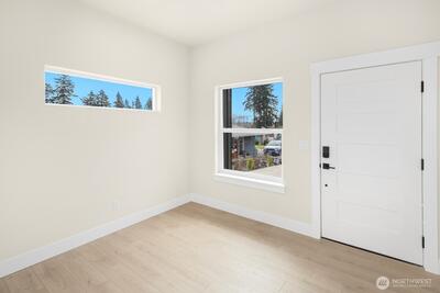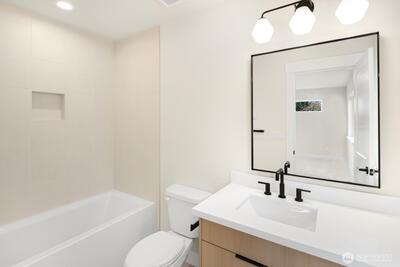 This stunning modern new-construction home showcases exquisite craftsmanship and high-quality finishes throughout. Ideally located just minutes from Downtown Burien, you’ll enjoy easy access to diverse dining options, shopping, and the popular weekly Farmers Market. The home makes an immediate impression with its striking curb appeal. Inside, a spacious U-shaped kitchen features sleek quartz countertops and under-cabinet lighting, offering both style and functionality. Upstairs, you’ll find two generously sized bedrooms, each with its own full bathroom, along with a large utility room designed for everyday convenience. Every detail has been thoughtfully considered, from the keyless-entry front door to the Google Nest doorbell. This is a home you won’t want to miss. Interior photos are from another location with identical finishes and layout.