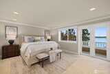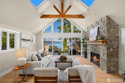 Perched above the shores of Lake Sammamish along a quiet dead-end street, this light-filled retreat pairs timeless architecture with effortless lakeside living. Vaulted ceilings soar above sunlit interiors and expansive windows frame shimmering water views. The main living space flows effortlessly to a sunset patio welcoming evenings under open skies. Refinished oak hardwoods sweep across the main level, leading to chef's kitchen wrapped in custom wood cabinetry and an oversized island designed for lively gatherings. Off the dining space, a private deck accented by a calming water feature creates seamless indoor-outdoor rhythm. Upstairs, the primary suite offers a serene escape with a Juliet balcony suspended above the lake's glow and a spa-inspired bath tailored for quiet indulgence. Two additional bedrooms and a luminous office crowned with skylights offer flexibility and light, completing this home where each detail is curated for inspired living just moments from the water.